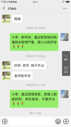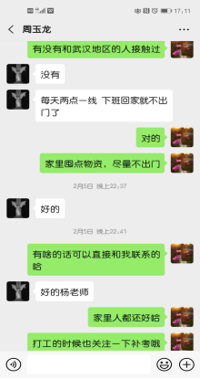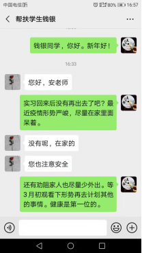 打响疫情防控战以来,纪委办、监察室、巡察办党支部所辖部门及全体职工按照学校要求,根据学校疫情防控工作领导小组工作部署,认真完成疫情防控各项任务安排。考虑到结对助学的学生们都处于实习阶段,有些同学可能在外实习,没有返回家中,纪委办、监察室、巡察办党支部党员们在疫情发生后,通过微信积极主动与结对助学学生联系,了解学生及家人近况,向学生宣传、介绍防御新型冠状病毒的相关政策和科学知识,疏导学生紧张情绪,将助学工作落到疫情防控工作实际中。