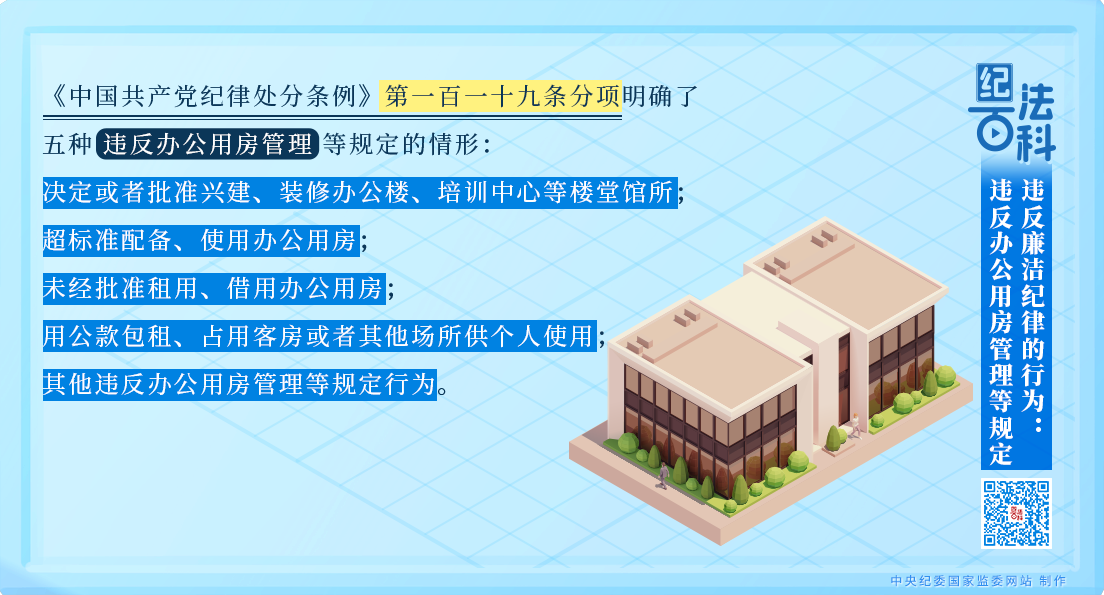 《中国共产党纪律处分条例》第一百一十九条分项明确了五种违反办公用房管理等规定的情形:决定或者批准兴建、装修办公楼、培训中心等楼堂馆所;超标准配备、使用办公用房;未经批准租用、借用办公用房;用公款包租、占用客房或者其他场所供个人使用;其他违反办公用房管理等规定行为。有上述行为之一,对直接责任者和领导责任者,情节较重的,给予警告或者严重警告处分;情节严重的,给予撤销党内职务处分。